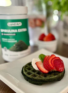 Une recette rafraichissante à base de spiruline, fromage à la crème végétale, basilic et fraise. Une gaufre qui saura plaire à tous !
