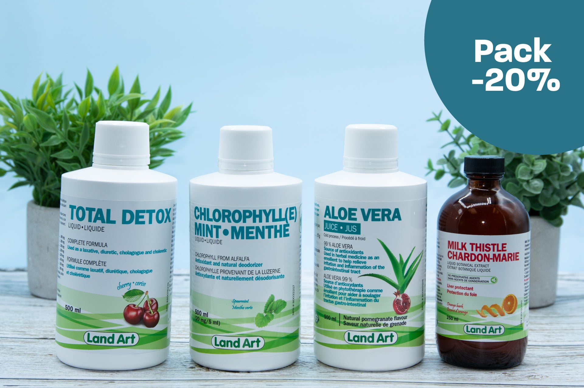 Land Art offre aussi le Pack Detox, qui inclue ces deux merveilleux produits ainsi que deux autres et qui vous permet d’économiser 20% sur la valeur totale des produits.